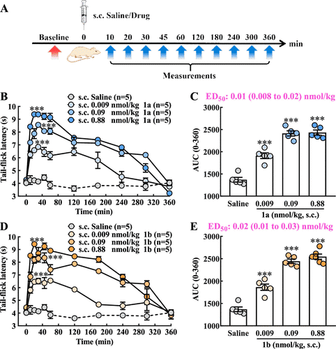 兰州大学、徐州医科大学的研究团队在上述文章中以先前发现的神经肽 FF受体多功能激动剂 DN-9 为基础,设计并合成了7种订书肽(Stapled Peptides)类似物,并通过多维度实验评估它们的活性,最终筛选出最优候选活性分子。实验人员以 DN-9为母肽,通过引入α-烯基氨基酸并进行关环复分解(RCM)反应合成 7 种全烃订书肽。在体外实验中,科研人员通过钙动员实验评估订书肽对 MOPr、κ-阿片受体(KOPr)、δ- 阿片受体(DOPr)及NPFF₁R、NPFF₂R的激动活性;在小鼠血浆和脑匀浆中测定代谢稳定性,计算降解半衰期。在体内实验中,科研人员采用甩尾实验评估皮下(s.c)、脑室内(i.c.v.)和口服(p.o)给药后的镇痛活性及持续时间;通过药理学实验(如使用受体拮抗剂)明确镇痛作用机制;借助旋转杆实验、胃肠道转运(GIT)实验、条件性位置偏爱(CPP)实验、纳洛酮诱发戒断实验及全身体积描记法,评估运动损伤、便秘、成瘾性和呼吸抑制等副作用;通过药代动力学研究(LC-MS/MS)分析最优化合物的血脑屏障穿透能力。研究人员在进行体外钙动员实验时,为了筛选稳定表达阿片受体及神经肽FF受体的CHO细胞,使用了由AbMole提供的Hygromycin B(Hygrovetine,潮霉素 B,AbMole,M2761),筛选浓度为100 μg/mL[4]。