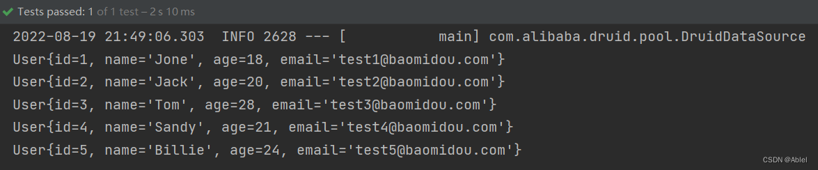 DROP TABLE IF EXISTS user; CREATE TABLE user ( id BIGINT(20) NOT NULL COMMENT '主键ID', name VARCHAR(30) NULL DEFAULT NULL COMMENT '姓名', age INT(11) NULL DEFAULT NULL COMMENT '年龄', email VARCHAR(50) NULL DEFAULT NULL COMMENT '邮箱', PRIMARY KEY (id) ); DELETE FROM user; INSERT INTO user (id, name, age, email) VALUES (1, 'Jone', 18, 'test1@baomidou.com'), (2, 'Jack', 20, 'test2@baomidou.com'), (3, 'Tom', 28, 'test3@baomidou.com'), (4, 'Sandy', 21, 'test4@baomidou.com'), (5, 'Billie', 24, 'test5@baomidou.com');