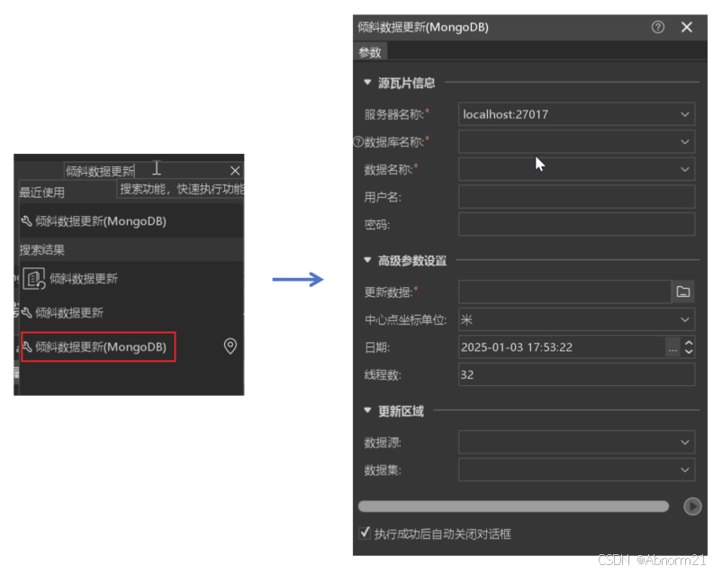1、按Ctrl+F键打开功能搜索框,搜索“倾斜数据更新”,打开“倾斜数据更新(MongoDB)”功能框。