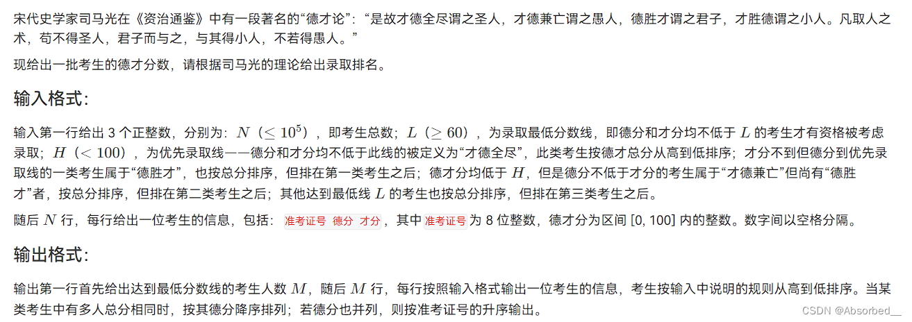3.开始我的想法是用一个结构体数组,直接全部排序,但是这个题目里有两个排序条件,一个是德分一个是才分,所以这个种思路是很难排序的,