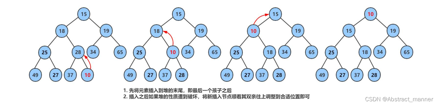 先插入一个10到数组的尾上,再进行向上调整算法,直到满足堆。