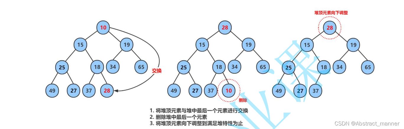 删除堆是删除堆顶的数据,将堆顶的数据根最后一个数据一换,然后删除数组最后一个数据,再进行向下调整算法。