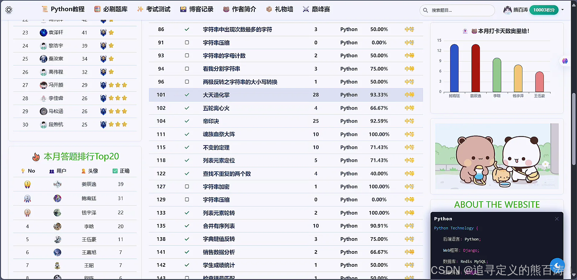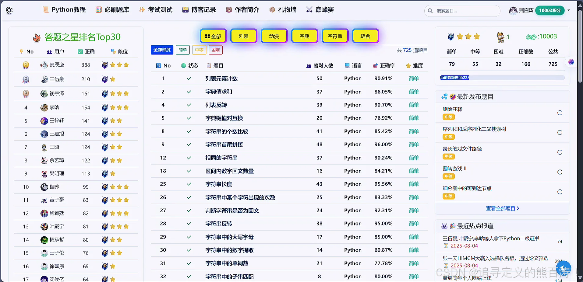 📖 题库模块:会展示数据库中的题目,并且按照分类正确率,难度等级,进行排名和筛选,左侧有成绩排行榜,右侧区域是汇集了积分排行榜,最新题目展示,学生热门报道展示,打卡天数可视化等展示等系列模块,答题可以获得积分,题目等级难度不同,积分不同,同时支持多维度搜索🔍!