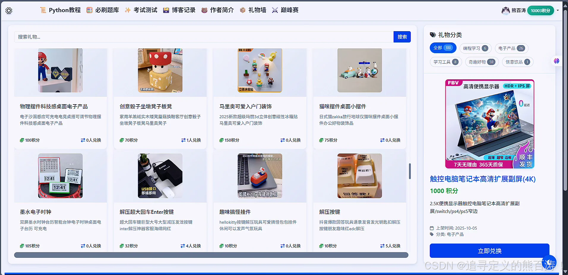 设计理念:构建虚拟经济循环,通过积分奖励机制将学习成果转化为 tangible 回报,形成学习正反馈。