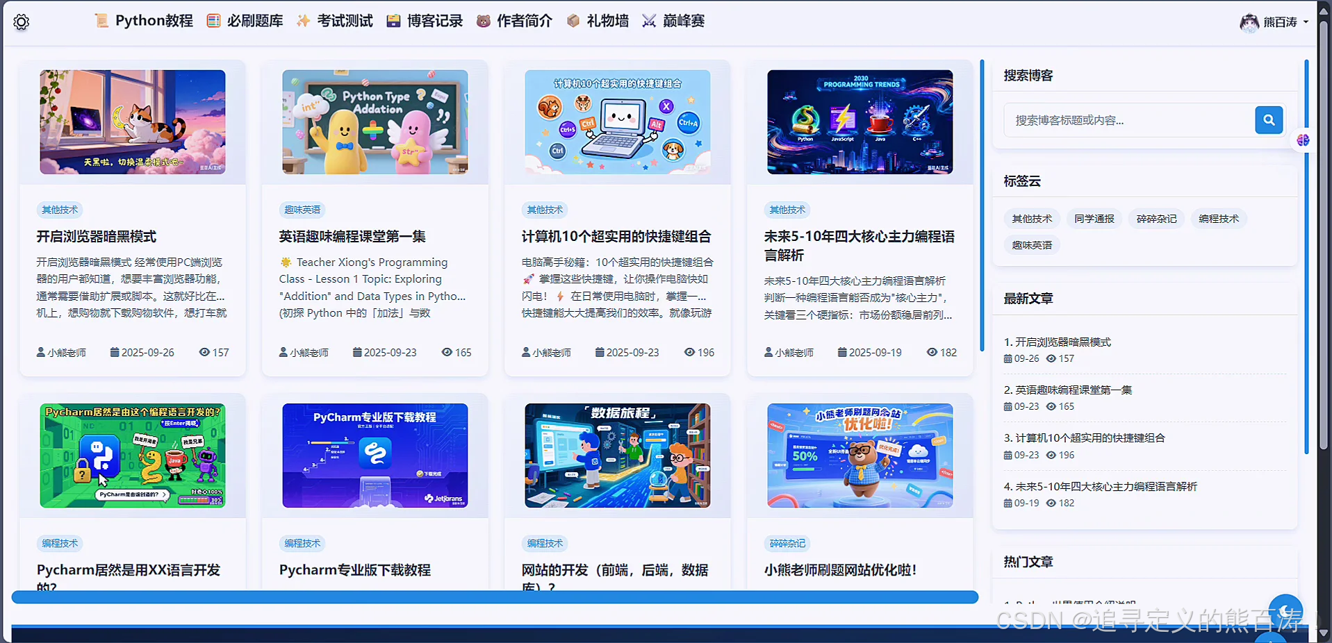 📖 博客模块:是放置一些关于编程技术的博客,同样在右侧会显示热门博客和最近博客,并且允许用户全文搜索,旨在拓展同学们的眼界,了解更多的编程技术!