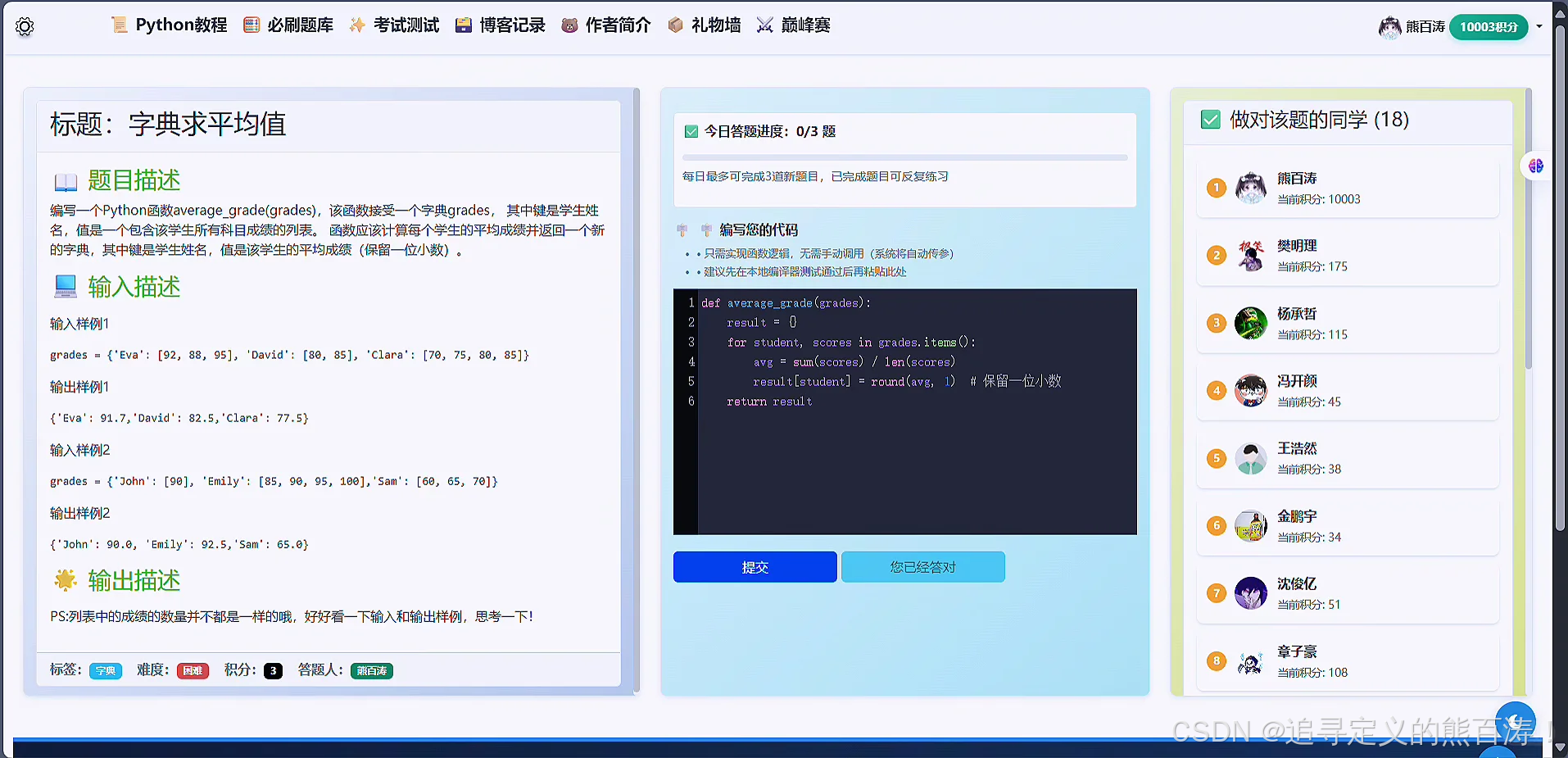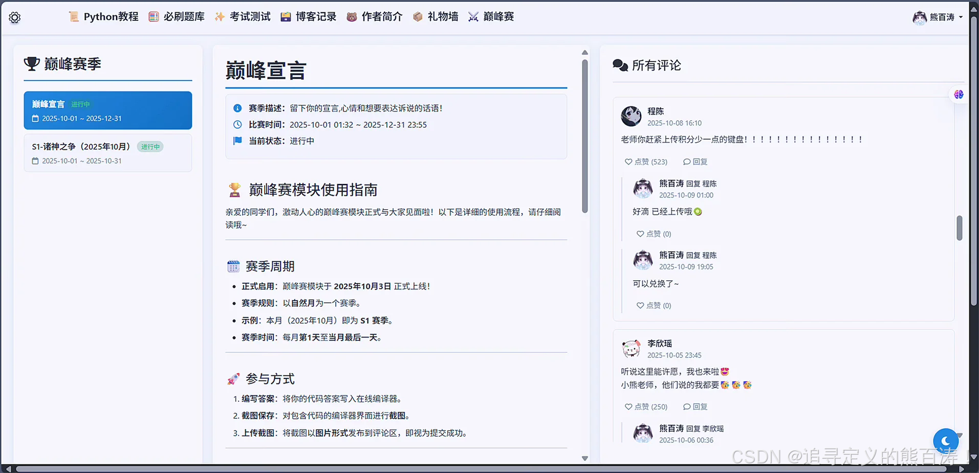 📖 巅峰赛模块:展示相对较灵活复杂题目,同学可以挑战进阶 获取高额积分,同时学生也可以互相评论交流.
