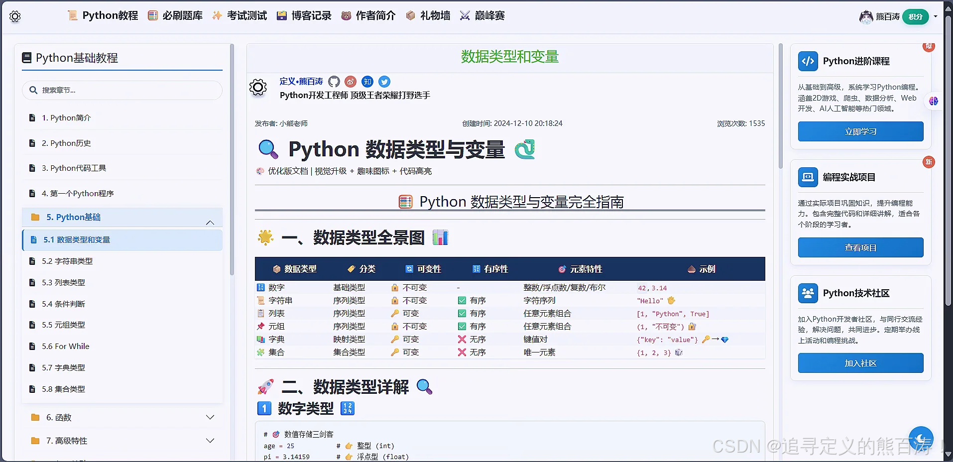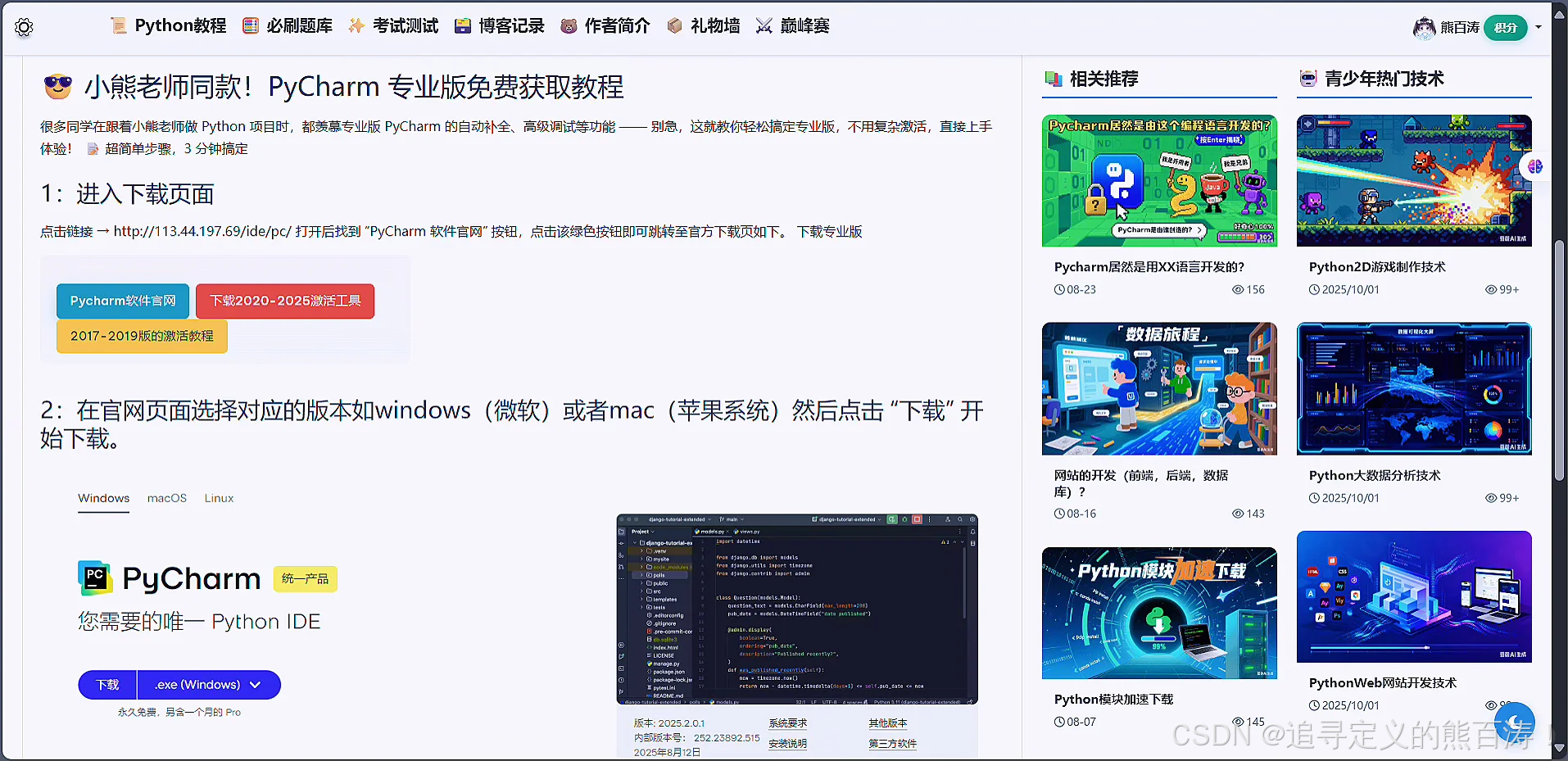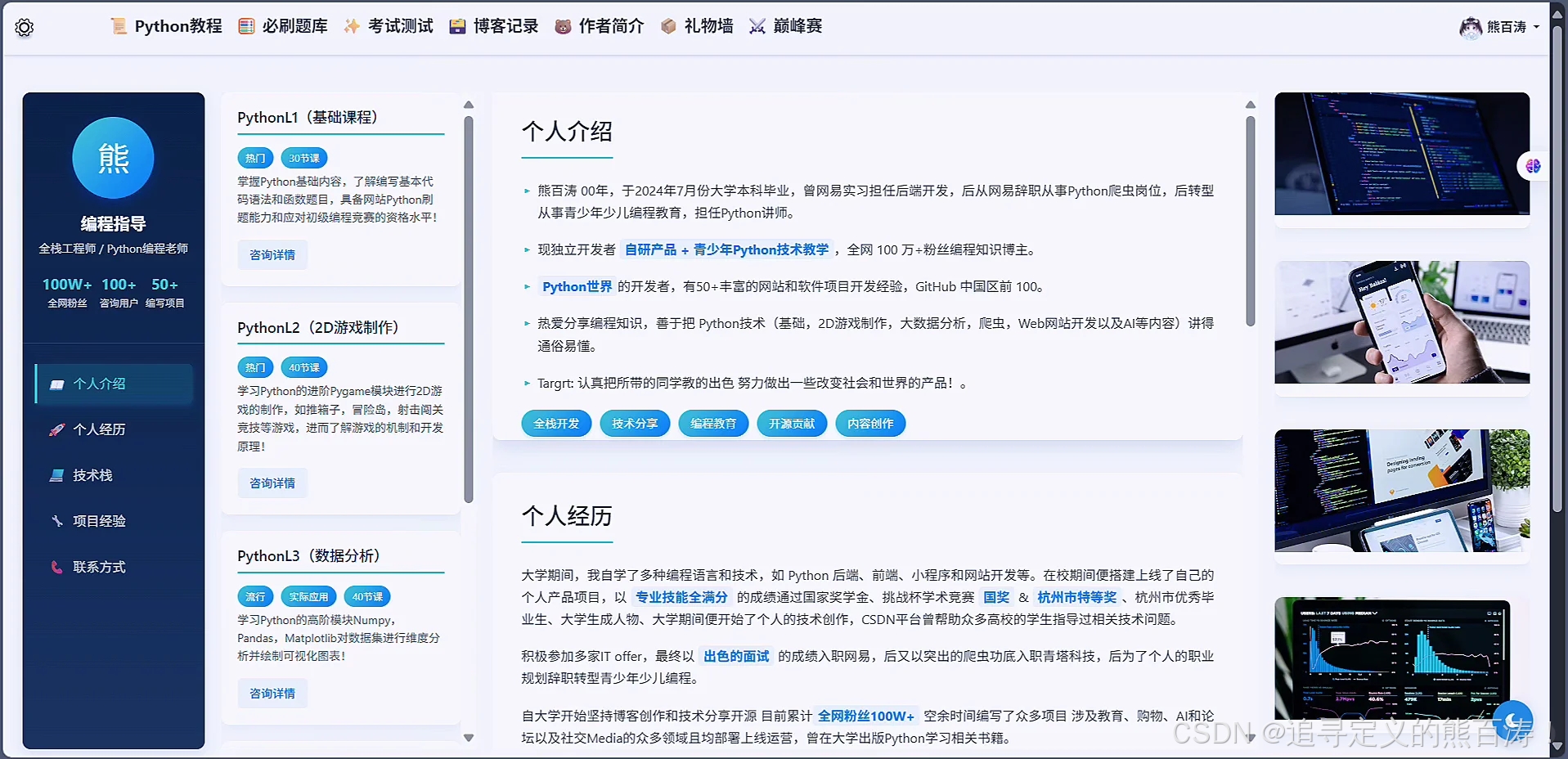 第一个是在网易做后端开发,第二个是在青塔科技做爬虫。然后呢,在今年的7月份算是裸辞在做独立开发者以及同时做青少年编程教育这个行业,并且也在手底下带教近30位同学,所以前段时间就想着给同学们做一款学习网站,这样的话,在课上可以跟着我学,放学之后呢,可以在家里看看技术,刷刷题,逛逛网站,可以让学习形成一个闭环,也算比较不错。