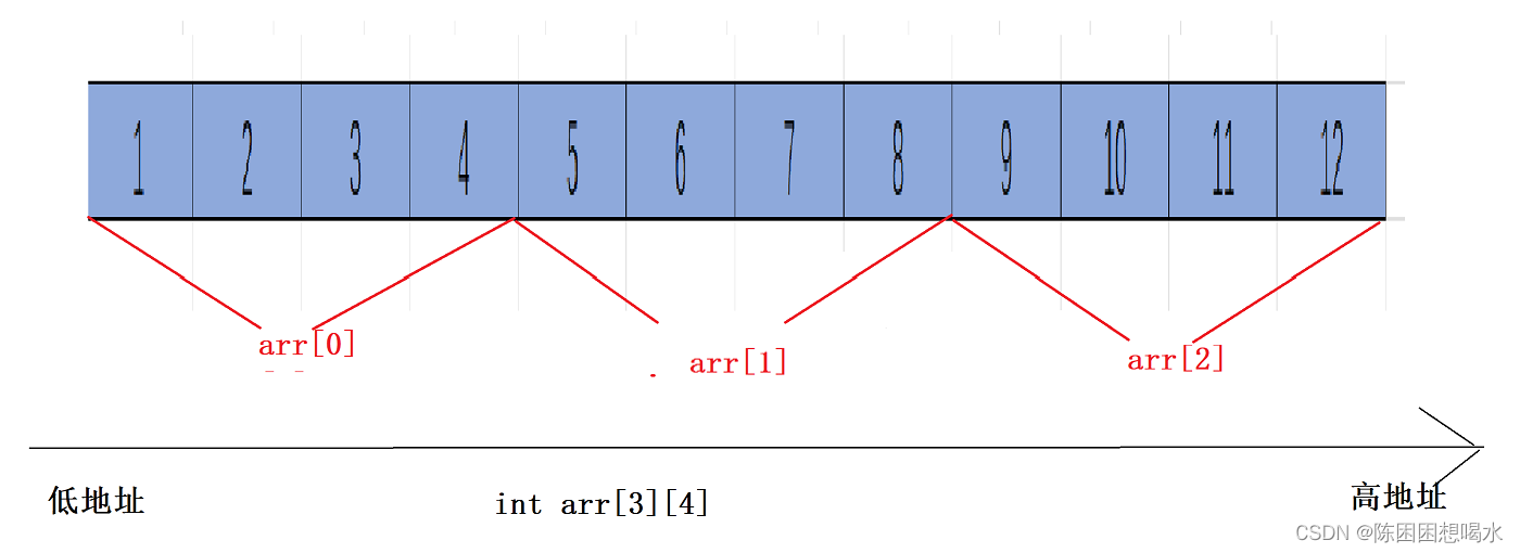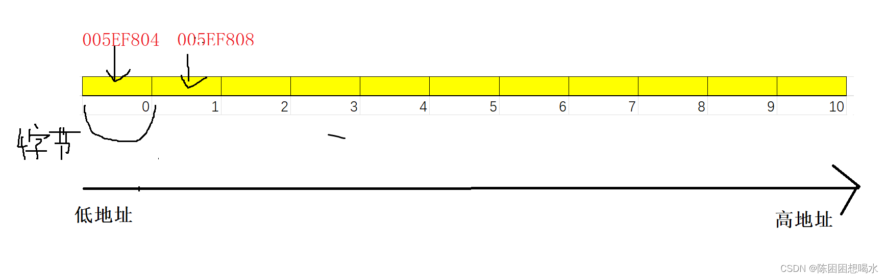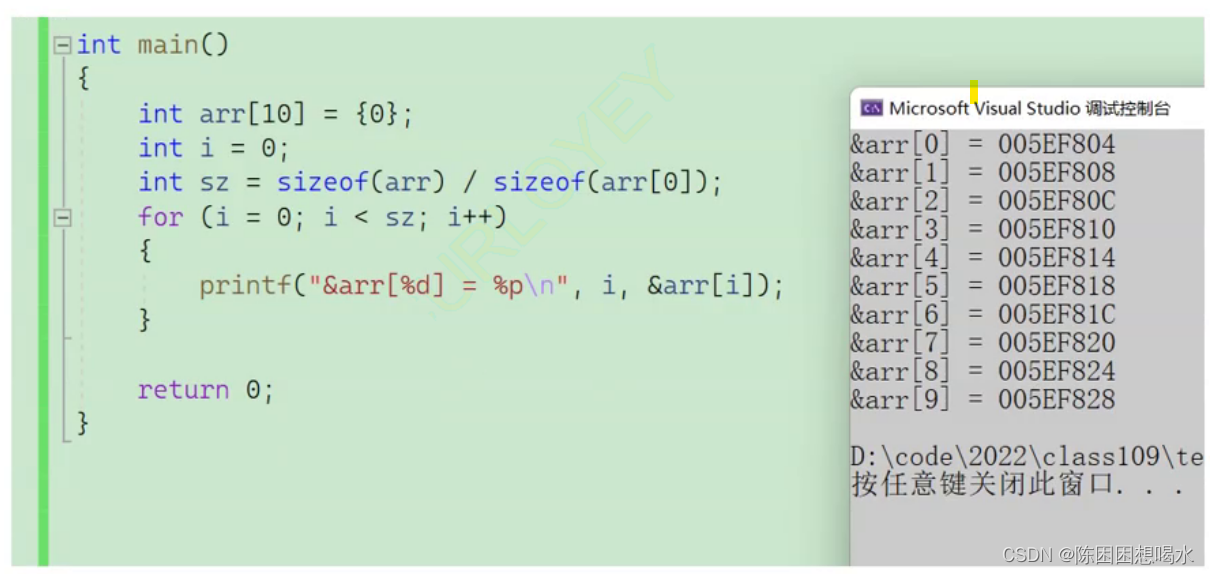 由上面的代码我们可以发现,每相邻两个元素之间差4,而整型的大小为4个字节,由此我们可以发现数组在内存中是连续存放的,随着下标的变换,地址由底到高变化。