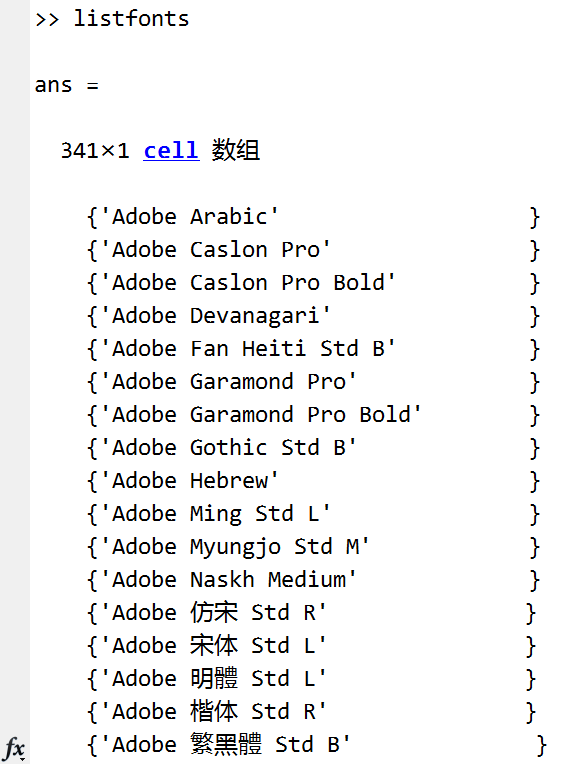在命令行中输入:listfonts,执行查看自己的MATLAB所有字体查看所有字体。字体表附后文。