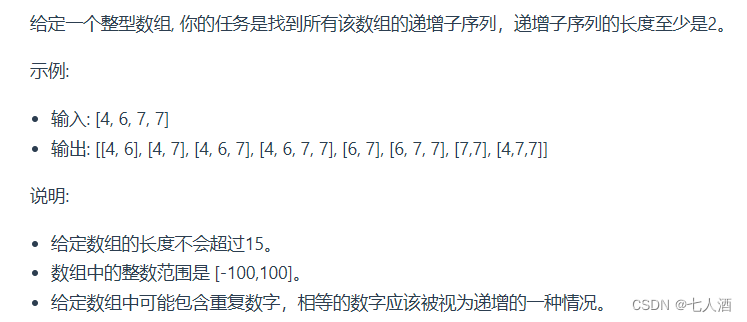 unordered_set<int> uset;是记录本层元素是否重复使用,新的一层uset都会重新定义(清空),所以要知道uset只负责本层!class Solution { private: vector<vector<int>> result; vector<int> path; void backtracking(vector<int>& nums, int startIndex) { if (path.size() > 1) { result.push_back(path); // 注意这里不要加return,要取树上的节点 } unordered_set<int> uset; // 使用set对本层元素进行去重 for (int i = startIndex; i < nums.size(); i++) { if ((!path.empty() && nums[i] < path.back()) || uset.find(nums[i]) != uset.end()) { continue; } uset.insert(nums[i]); // 记录这个元素在本层用过了,本层后面不能再用了 path.push_back(nums[i]); backtracking(nums, i + 1); path.pop_back(); } } public: vector<vector<int>> findSubsequences(vector<int>& nums) { result.clear(); path.clear(); backtracking(nums, 0); return result; } };