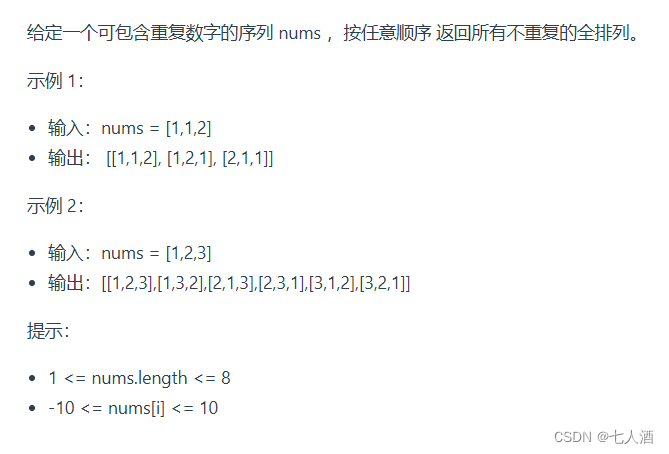 for (int i = 0; i < nums.size(); i++) { if (used[i] == true) continue; // path里已经收录的元素,直接跳过 used[i] = true; path.push_back(nums[i]); backtracking(nums, used); path.pop_back(); used[i] = false; }class Solution { public: vector<vector<int>> result; vector<int> path; void backtracking (vector<int>& nums, vector<bool>& used) { // 此时说明找到了一组 if (path.size() == nums.size()) { result.push_back(path); return; } for (int i = 0; i < nums.size(); i++) { if (used[i] == true) continue; // path里已经收录的元素,直接跳过 used[i] = true; path.push_back(nums[i]); backtracking(nums, used); path.pop_back(); used[i] = false; } } vector<vector<int>> permute(vector<int>& nums) { result.clear(); path.clear(); vector<bool> used(nums.size(), false); backtracking(nums, used); return result; } }