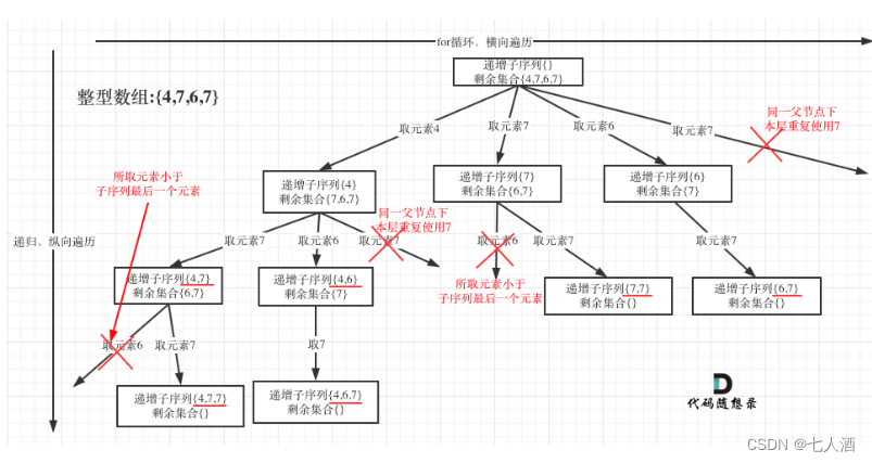 unordered_set<int> uset; // 使用set来对本层元素进行去重 for (int i = startIndex; i < nums.size(); i++) { if ((!path.empty() && nums[i] < path.back()) || uset.find(nums[i]) != uset.end()) { continue; } uset.insert(nums[i]); // 记录这个元素在本层用过了,本层后面不能再用了 path.push_back(nums[i]); backtracking(nums, i + 1); path.pop_back(); }