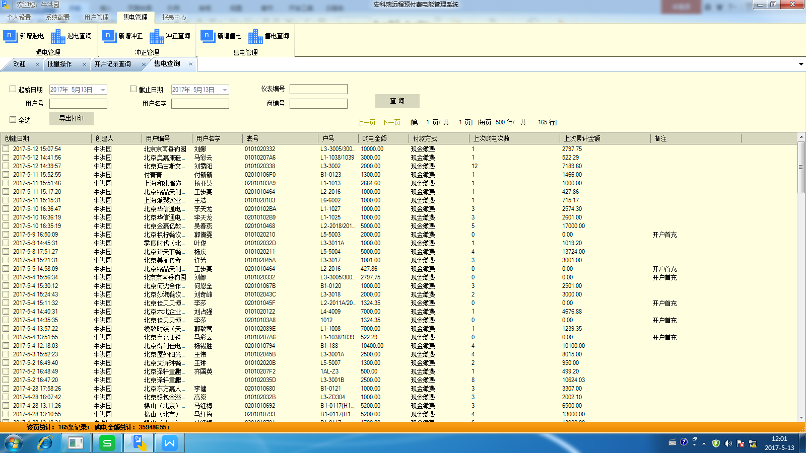 4.售电管理:对已开户的表进行远程售电、退电、冲正及记录查询等操作;