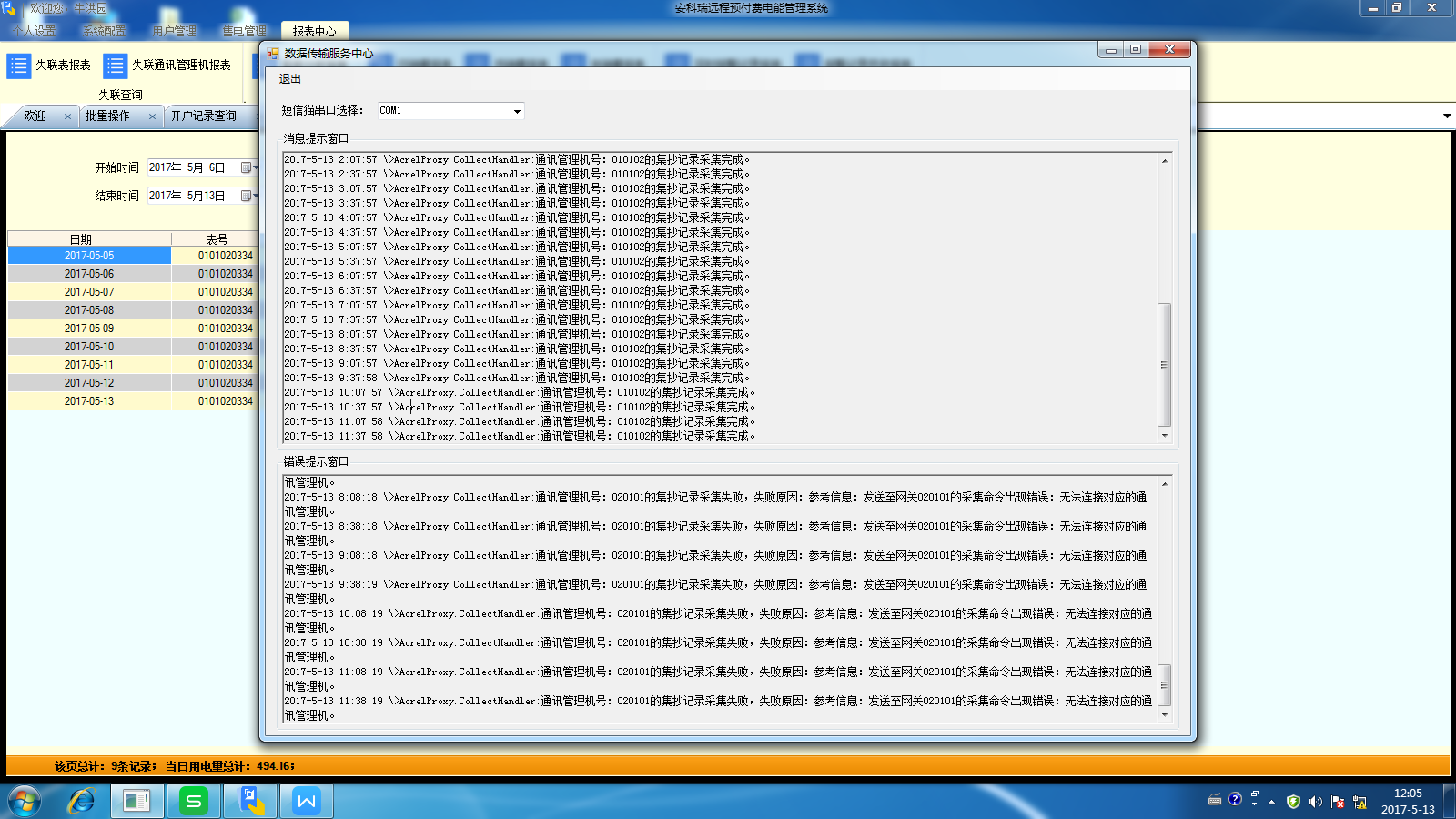 集中抄表服务程序包含三大模块,除了常年运行的定时对所有仪表进行集中远程抄表以外,还集成了报警短信发送服务,能将电费金额预警和欠费预警自动生成手机短信自发送给对应的宿舍用户,该功能需要与硬件短信猫配合使用。