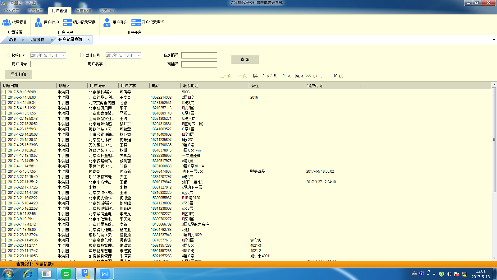 3.用户管理:对宿舍用户执行开户、销户、远程分合闸、抄表导出及记录查询等操作;