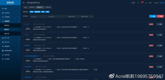显示充电桩的故障信息及处理进度,故障类型包括过压、欠压、空载、绝缘检测故障、漏电、过温、短路等。