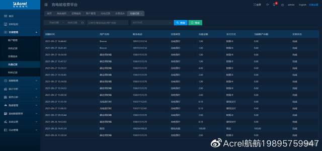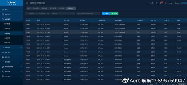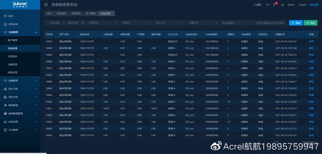 显示所有订单数据,可以对订单按照充电站、充电桩、支付方式、交易状态等进行分类查询,可对充电中的充电桩进行停止充电操作。