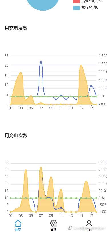 可按日、月、季度、年查看充电次数、充电时长、充电金额,同时显示对应的曲线图。