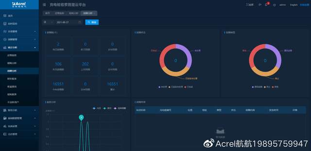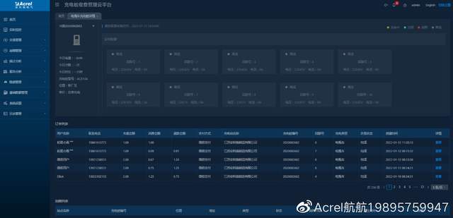 显示充电桩各回路的状态及充电数据,统计充电桩今日充电数据、订单记录、故障信息,可以查看订单和故障的详情。