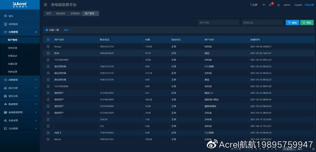 显示所有关联充电用户的账户信息,可进行充值、退款、冻结、解冻、注销等操作。