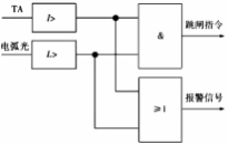 弧光保护的原理,如图 1所示,它的动作判断据为故障时产生的两个条件,也就是弧光和电流增量。在发生故障时,它会检查开关柜,然后,在同时检测到弧光和电流增量时,就会下达跳闸的指令。