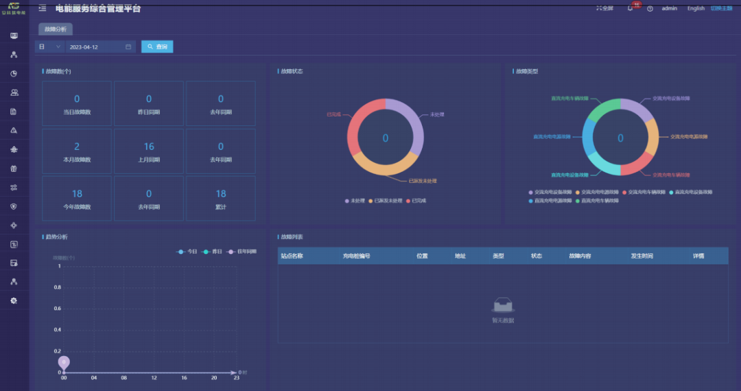 故障分析:提供故障汇总、故障状态饼图、故障趋势分析、故障类型饼图等功能。