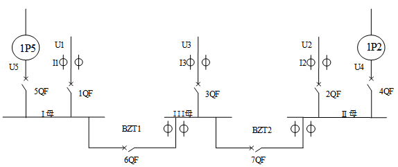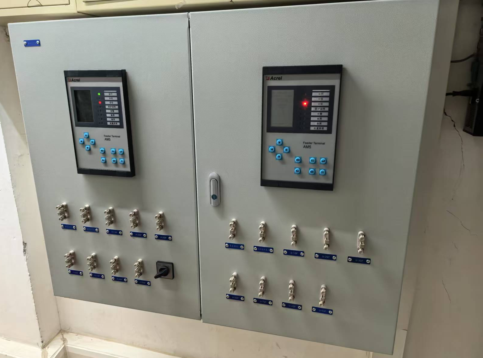 三路站用变均为10/0.4kV,且来源于同一10kV母线。其中进线1、进线2为主用进线,进线3作为两路进线其中之一的热备用(当两路主用进线均失电时,只给I段母线供电),III段母线不带负载;两路柴发进线作为站用变进线的备用。本项目采用两台低压备自投装置AM5-DB采集三路站用变进线电压电流、两路柴发电压及各断路器位置状态,并集成了7个断路器的分合闸控制信号及两个柴油发电机的启动信号实现对该低压系统的备自投投切的控制。本项目两台AM5-DB低压备自投保护装置安装在该配电房改造新增设的备自投壁挂箱体中。