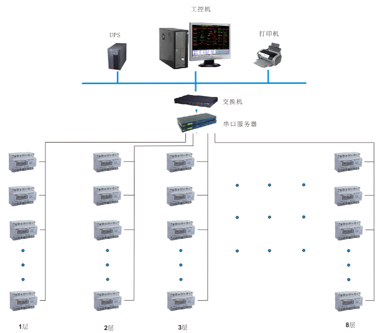 现场设备层主要为:远程预付费电度表。这些装置分别对应相应的一次设备安装在电气柜内,这些装置均采用RS485通讯接口,通过现场MODBUS总线组网通讯,实现数据现场采集。