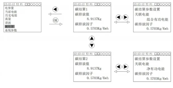 碳结算界面包含12组碳排放值及对应的排放因子,按上下键切换12组碳排放值按右键可修改关联的电能及排放因子。