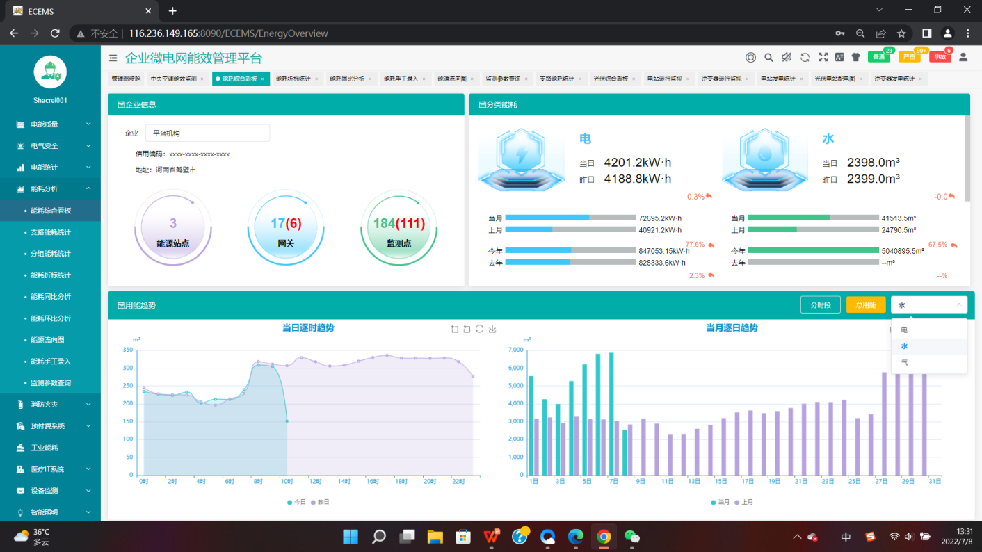 针对校园水、电、气等各类接入能源进行统计分析,包含同比分析、环比分分析、损耗分析等。了解用能总量和能源流向。