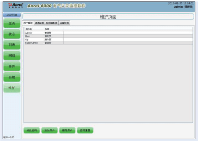 该界面可添加新的“操作员”和“值班员”权限的新用户,也可删除这两个级别的现有用户,该管理功能只有“超级管理员”和“管理员”可进行操作。