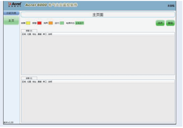 包含“登陆”、“消音”、“运行监视界面”及“系统状态栏”四部分,可以分别通过点击系统主界面上方的菜单栏或快速启动栏内按钮进入各相关功能界面。
