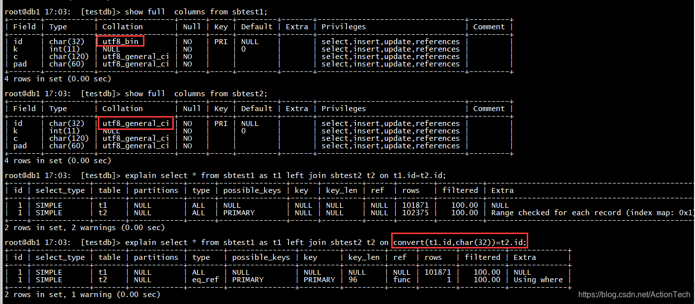 - 查看图 3 表结构和列信息对比,两个表的 id 字段排序规则不同存在隐式转换。如下:sbtest1 表 id 字段 char(32) 排序规则 utf8_binsbtest2 表 id 字段 char(32) 排序规则 utf8_general_ci
