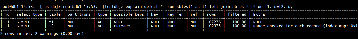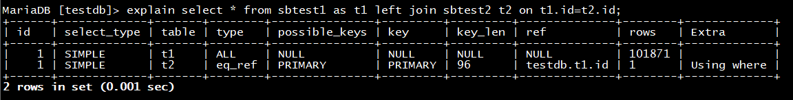 MySQL 5.7 检测到表 sbtest1 的 id 字段和表 sbtest2 的 id 字段的 collation 不同,没有正常走索引,造成查询很慢。通过改变排序规则或使用 convert 转换可以解决。由于 MariaDB 和 MySQL 的 collation 转换规则对执行计划的影响不同,在 MariaDB 中,不同的 Collation 并没有影响到查询效率。