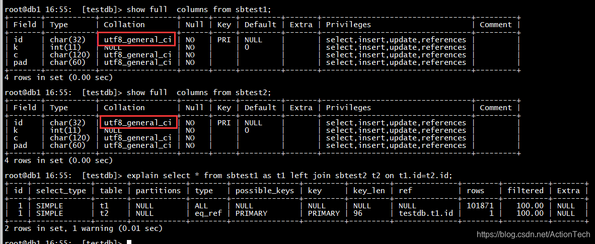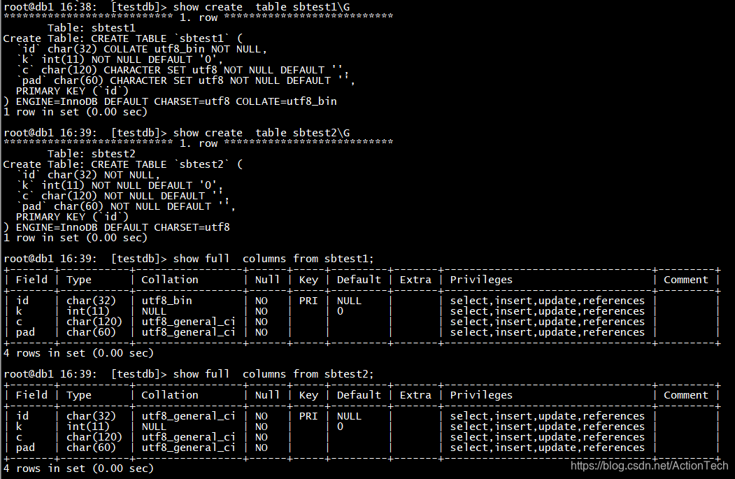 - 将 sbtest1 表 id 字段排序规则 utf8_bin 改成 utf8_general_ci