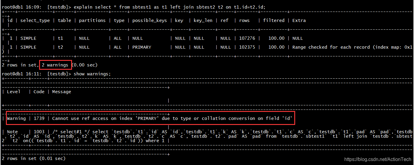 从 MySQL 5.7 执行计划的 warnings 中,可以清晰的看到 id 字段的字段类型或排序规则转换,无法使用索引。