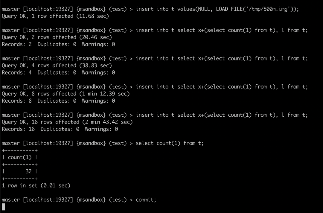 再制造一张大表,这里用到了之前的造表法,不同的是使用了一个 longblob 字段,让少数的几行记录就能占用很大的 binlog 空间,方便我们后面做实验。