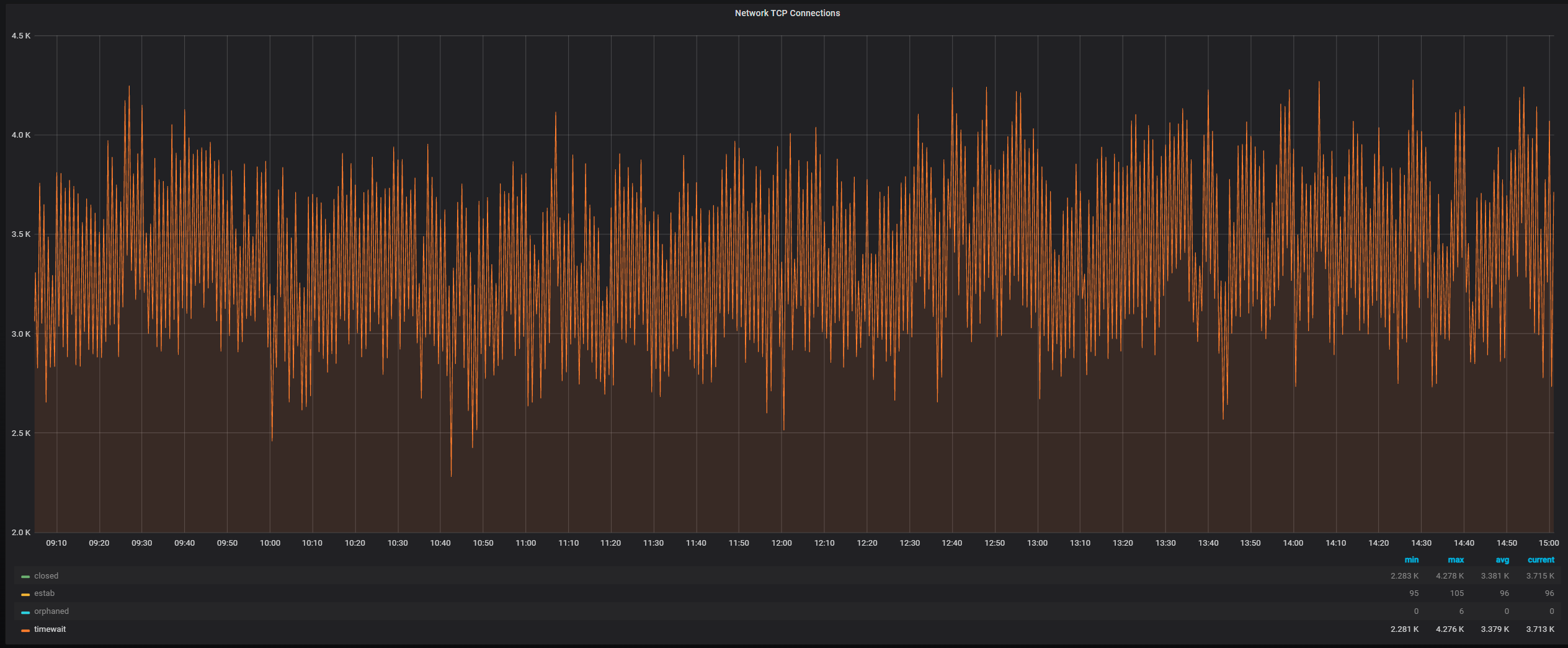 最近客户的一台 MySQL Server 告警处于 TCP TIME_WAIT 状态的连接过多,通过查看相关监控发现 TCP Connections 中处于 TIME_WAIT 状态的连接一直在 3000~4000 ,如图: