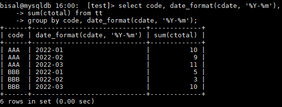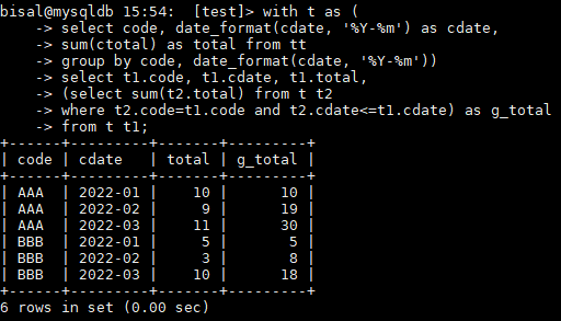 原始的统计语句如下所示,按照 code 和 cdate 进行聚类,统计出每个 code 每个月累加的记录数,