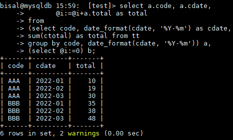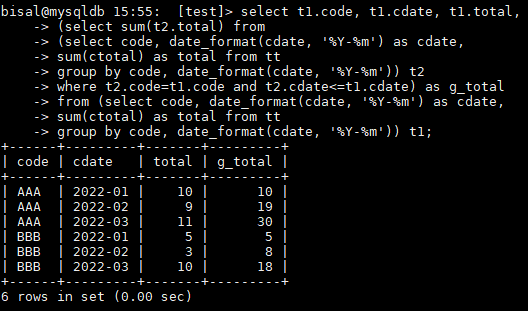 但是他的需求是能按照 code+cdate 的统计值进行累加显示,例如上图中第一行的 total 是10 ,第二行的 total 就显示10+9=19 ,第三行的 total 就显示10+9+11=30 ,以此类推。