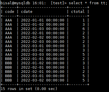 同事提了一个 MySQL 数据库中 SQL 统计数据的问题,我用测试数据模拟一下,如下所示,表 tt 有三个字段,code 是标识名称,cdate 是对应的日期,ctotal是个统计值