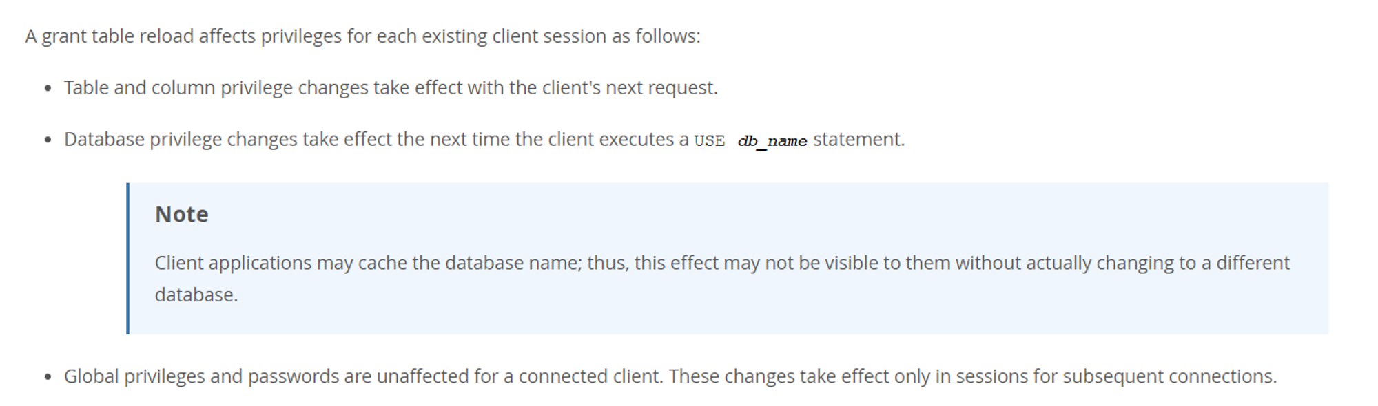 其中,第一种需要通过 FLUSH PRIVILEGES 来重新加载权限表。而第二种通过 MySQL 内部命令去更新权限,它会自动去重载权限表。但值得一提的是,刷新了权限表并不意味了你就拥有了对应的权限,具体的生效需分为如下三种情况,官方文档 早有说明。