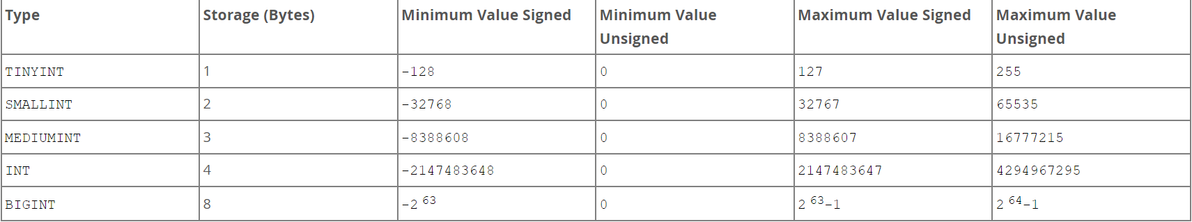 MySQL 支持的整数类型所需要的存储(字节)和范围 如下: