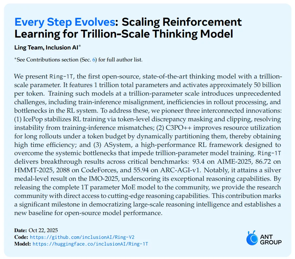- Ring-1T:一款基于 Ling 2.0 架构的思考模型,也是全球首个开源万亿参数思考模型。