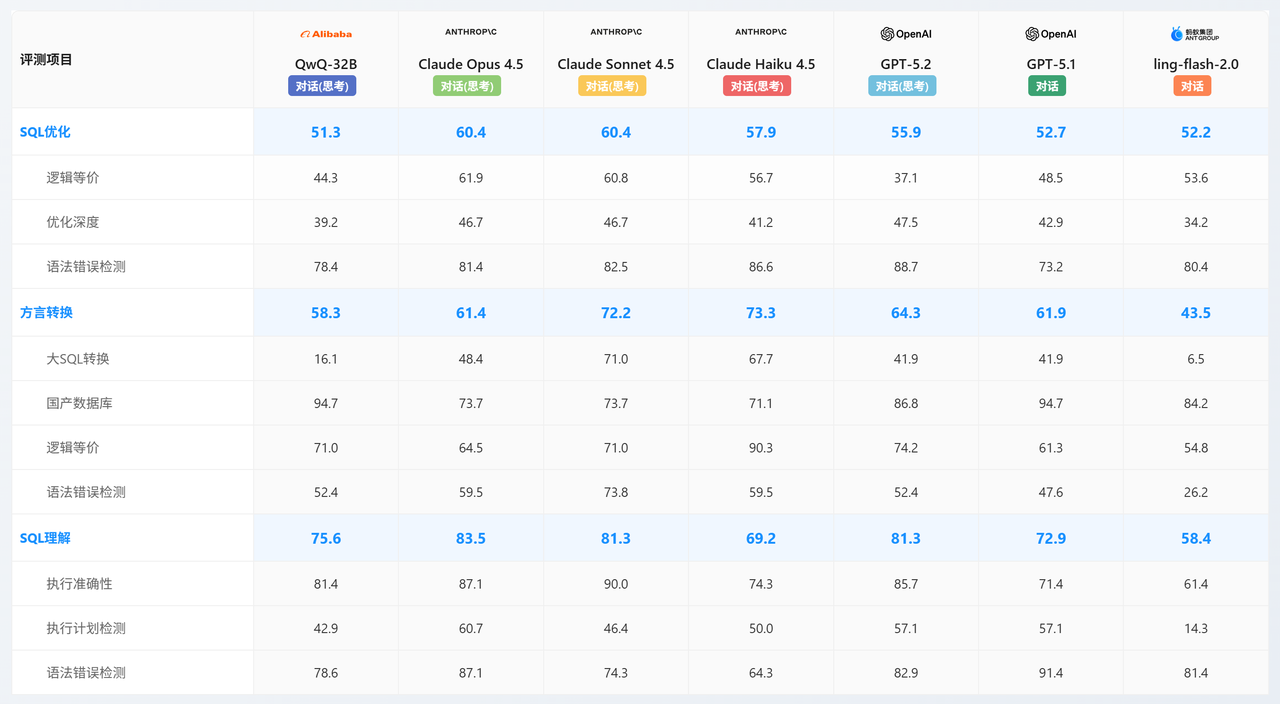 - 能力核心:该模型在 SQL 理解(83.5) 和 SQL 优化 (60.4) 两个最关键的维度均取得了全场最高分。它在执行计划检测(87.1) 和逻辑等价性(61.9)方面表现出极高的稳定性。