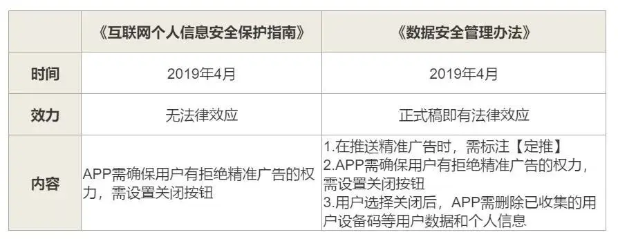 针对数字广告行业的明细条例也在今年的若干文件中提及,其中《互联网个人信息安全保护指南》提出用户有拒绝精准广告的权力,而“史上最严”、“比GDPR还严格”的《数据安全管理办法(征求意见稿)》,则直接约束了APP的行为,补充了明细。