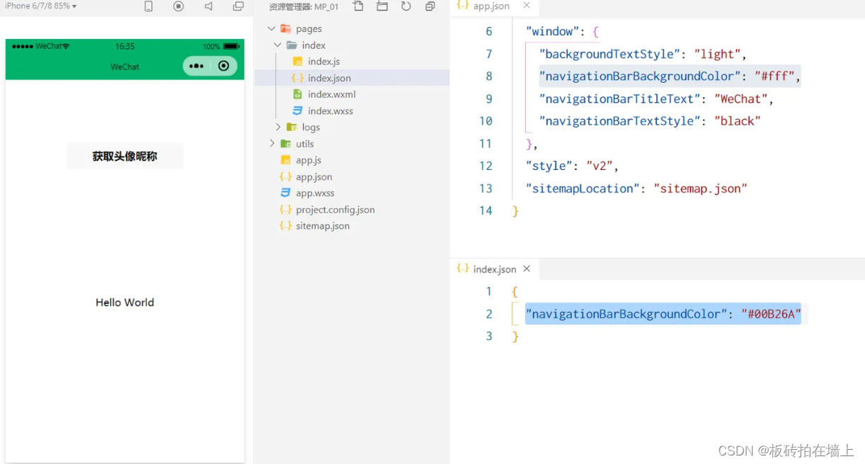 小程序中的每一个页面,可以使用.json 文件来对本页面的窗口外观进行配置,页面中的配置项会覆盖app.json 的window 中相同的配置项。