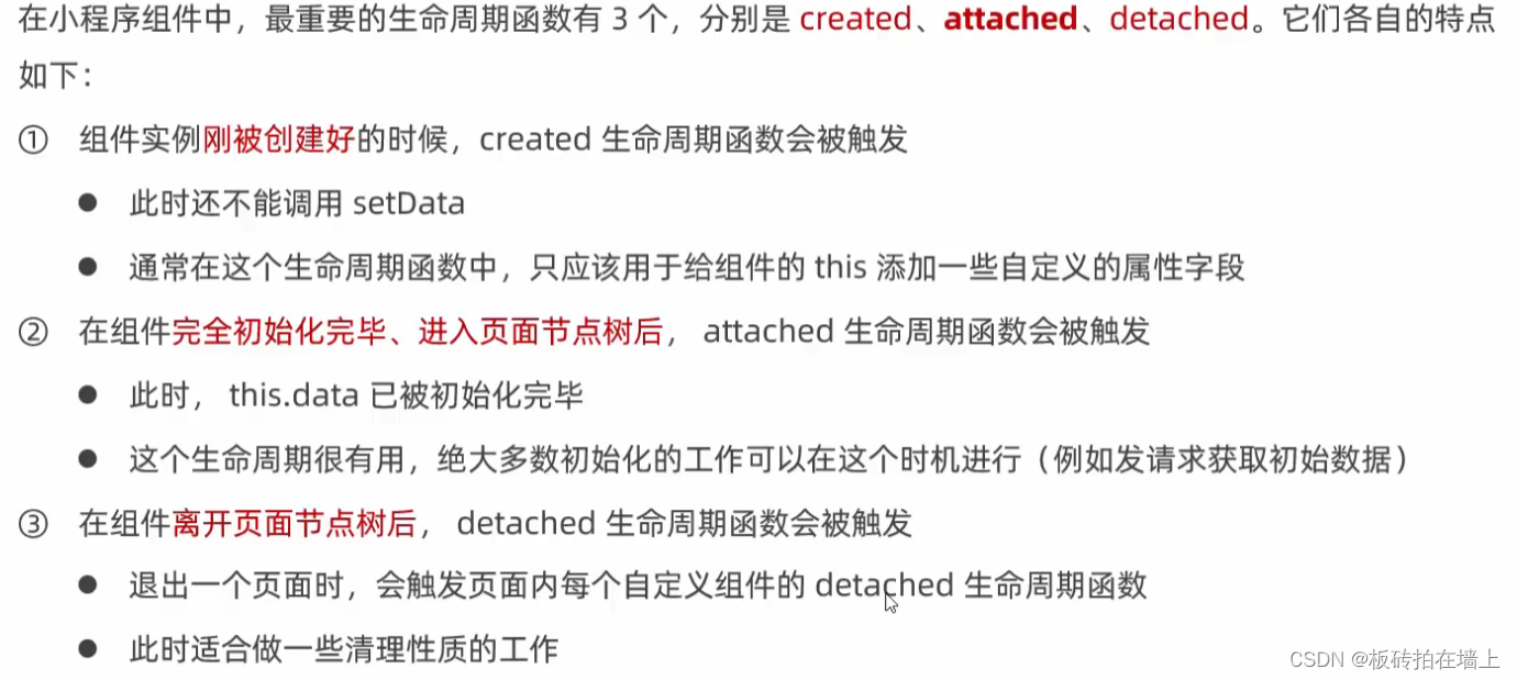 attached生命周期被触发。此时,this.data已被初始化为组件的当前值。这个生命周期很有用,绝大多数初始化工作可以在这个时机进行。 - 在组件离开页面节点树后,