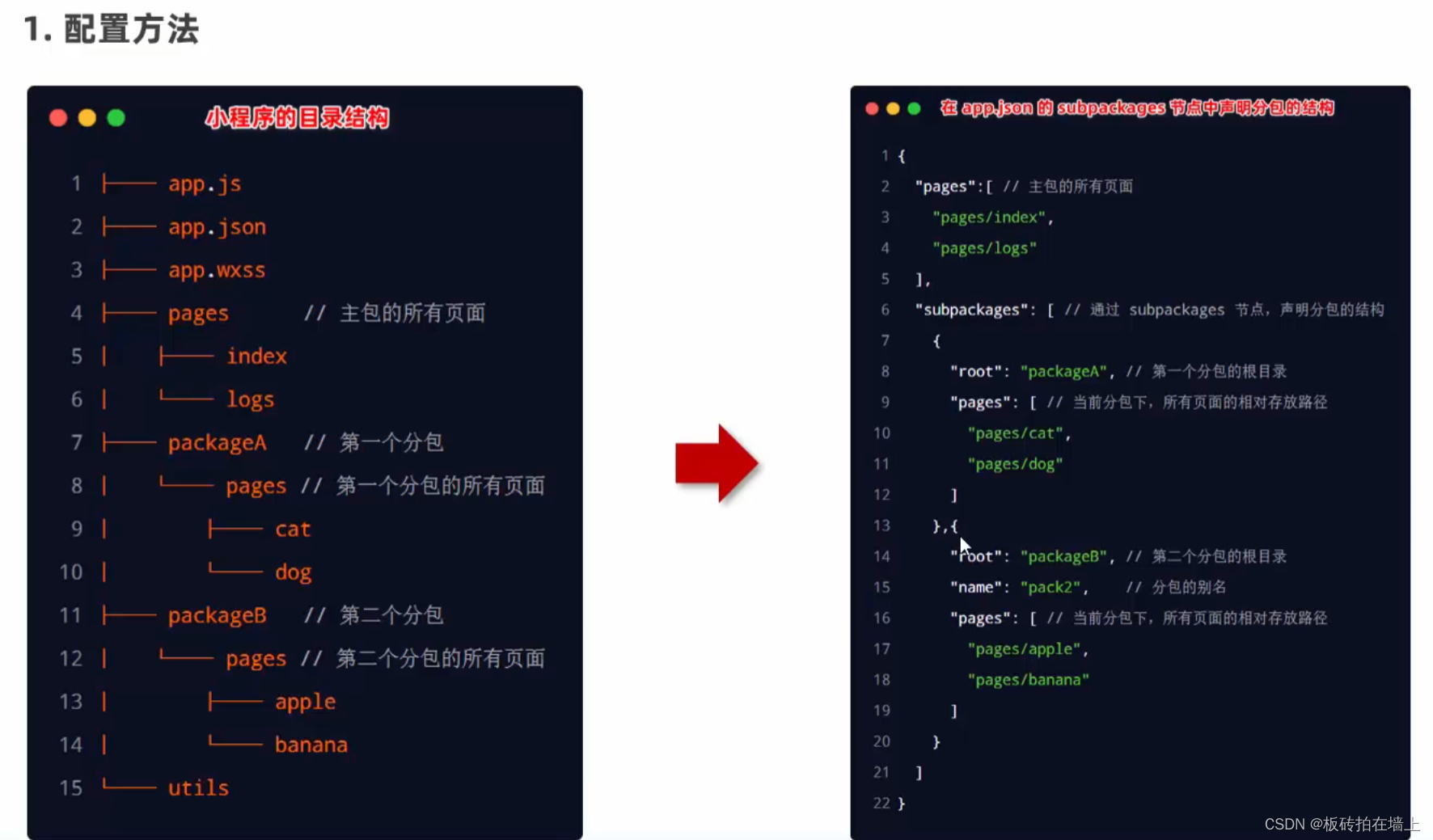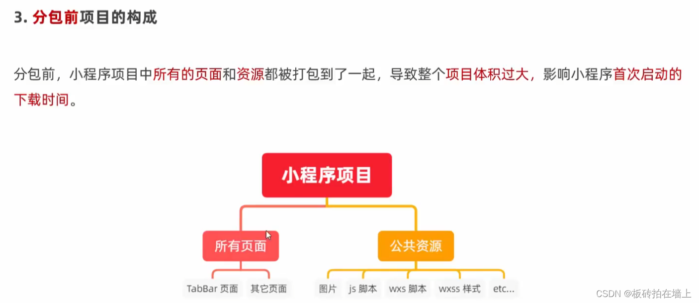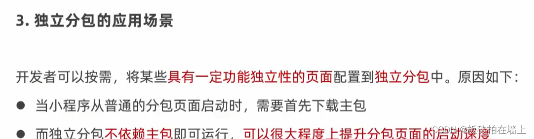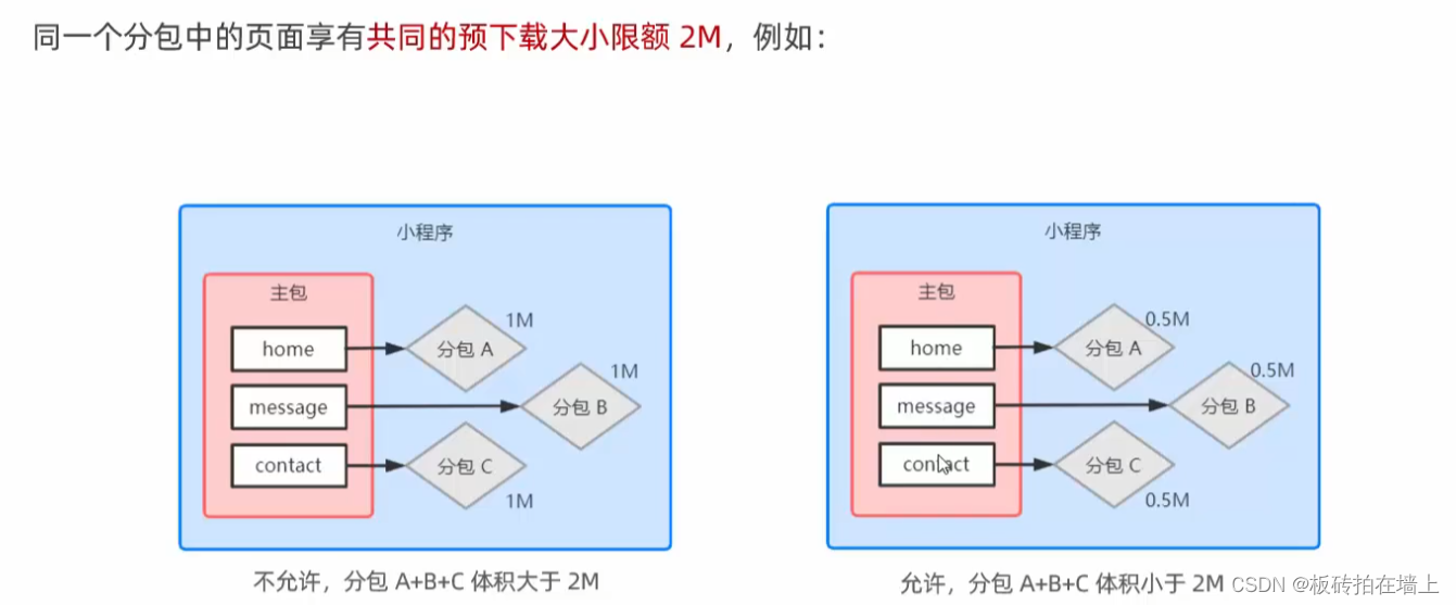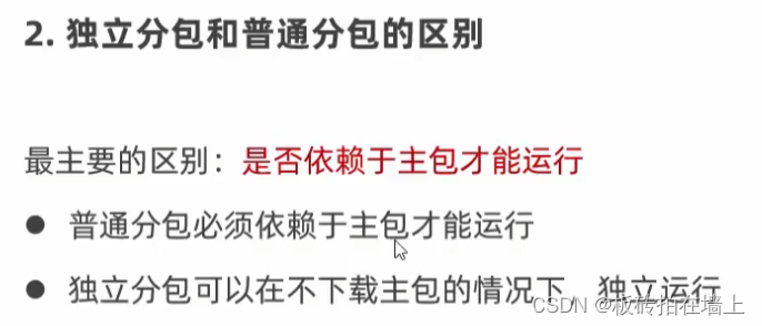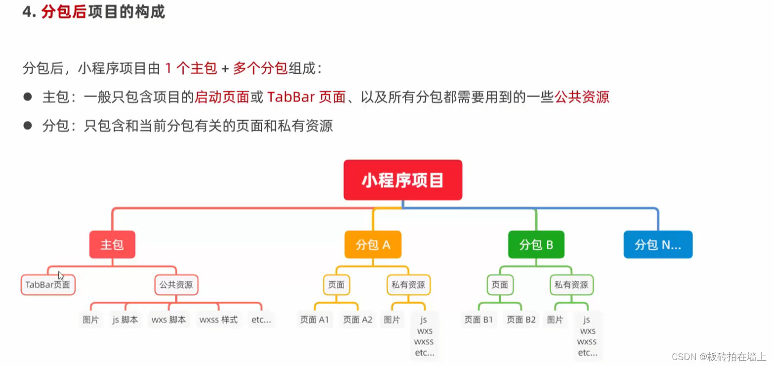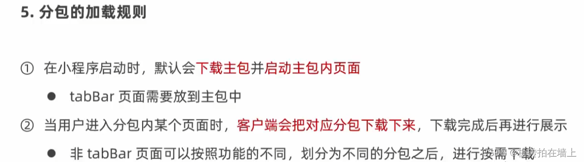 分包指的是把一个完整的小程序项目,按照需求划分为不同的子包,在构建时打包成不同的分包,用户在使用 时按需进行加载