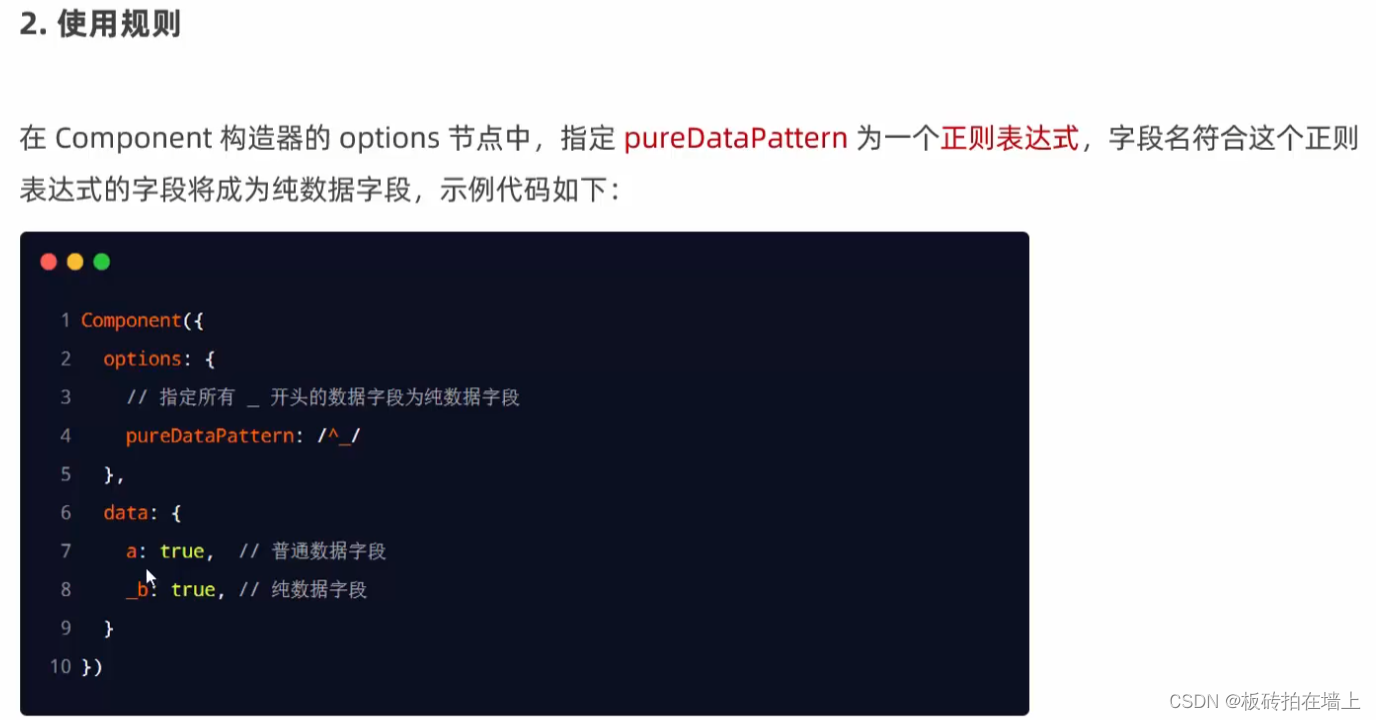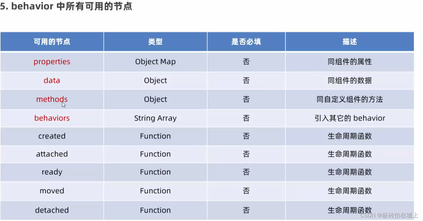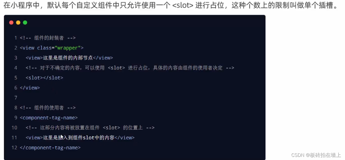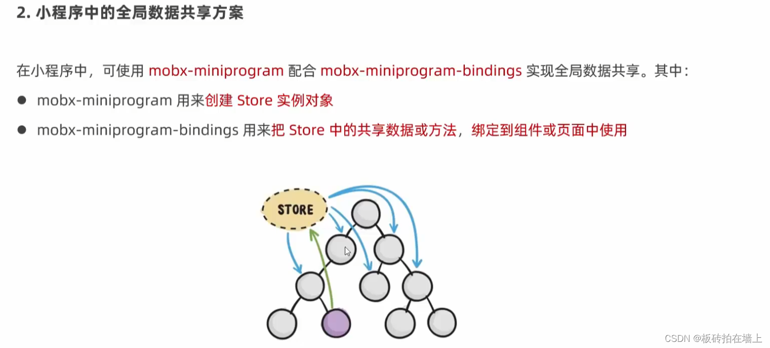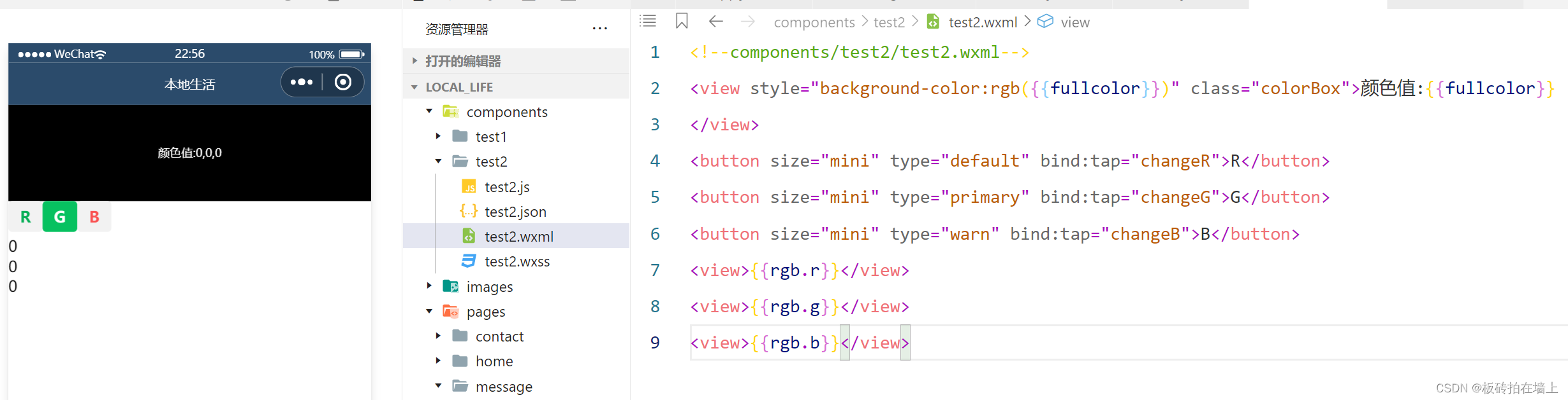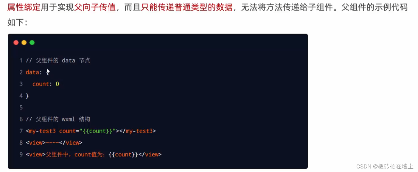 - WXML 数据绑定:用于父组件向子组件的指定属性设置数据,仅能设置 JSON 兼容数据(自基础库版本 2.0.9 开始,还可以在数据中包含函数)。具体在 组件模板和样式